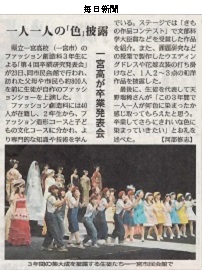 | 平成27年度 第4回 卒業研究発表会のテーマは『pigment』 今年度のテーマ「pigment」は顔料や絵の具を意味するのですが、入学時の真っ白だった状態から、3年間の経験をへて様々な色に染まり、色とりどりの個性を輝かせたいという意味が込められています。 昨年度に引き続き、一宮市民会館の広いステージで、1・2年生の協力を得ながら発表しました。 ファッション造形コースは、洋裁・和裁・ニットの技術を活かした創作作品や花嫁衣装の打掛・ウエディングドレスなどのフォーマル作品を身にまとった自作自演のファッションショーを、子どもの文化コースは、手作りの巨大な舞台装置や映像演出、声と演技の2人1役の劇「こびとのくつや」を上演しました。 |