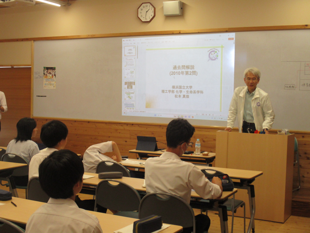 今年度も多くの生徒が参加をし、化学グランプリに向けた対策講演会を行いました。その中で、実際に化学グランプリの過去問に挑戦しました。講師の先生からは、過去問の解説に加えて、化学グランプリの概要や研究分野に関連したテーマでもご講演いただきました。後半では、量子化学についての講義も行われ、大学で学ぶ化学の内容についてもお話いただきました。化学が大好きな生徒のみならず、化学を深く学んだことがない生徒にとっても興味・関心が湧き、学習意欲を高めることができました。