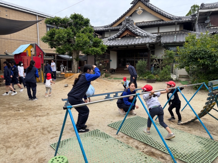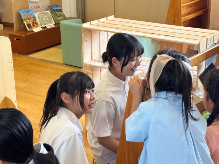 ・幼稚園は木が基調となる室内で、温かみを感じたし、外にも階段があったりその階段を利用して滑り台があったり遊具も多くてすごかったです。先生の接し方も「キレイな畳み方を見せてほしいな」というように「やって」という言い方ではなくてコツがあることを気づけました。