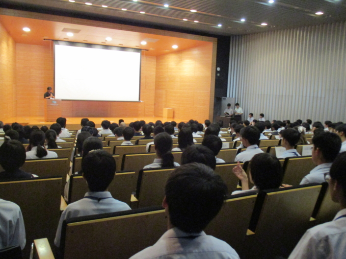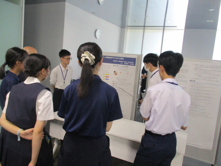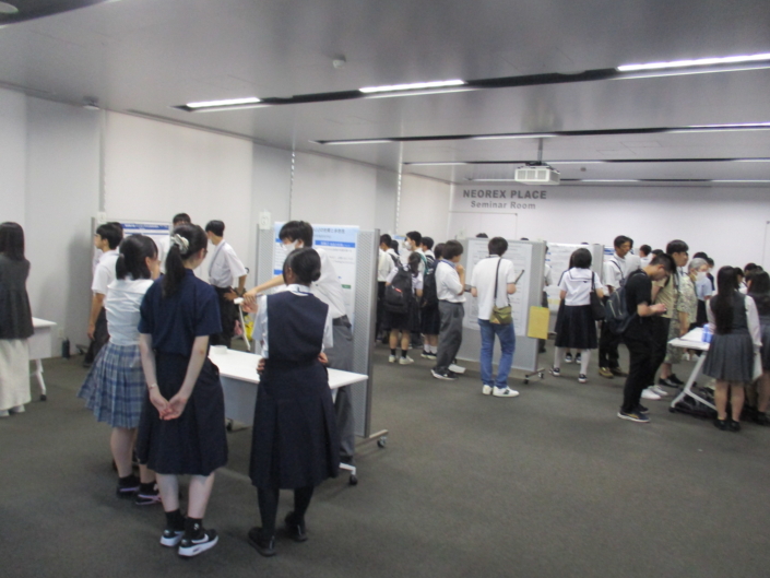 カンファレンスホールにて、各発表者は研究要旨を1分以内にまとめたミニスピーチを行い、ポスター会場に移動した後、研究内容と課題、展望の発表、質疑応答に臨みました。数学、情報、物理、地学、化学、生物などの様々な研究発表があり、発表者、聴衆の両者ともに、自身の課題研究を振り返り、深めるためのきっかけを得ました。ポスター発表では、発表者は複数の講師から指導、助言をもらい、閉会時には、参加者全員が大学教員の方々より研究を進める上で重視したい視点、姿勢についてのアドバイスをもらうことができました。