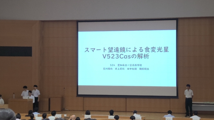 お知らせ/地学部 【地学部】SSH東海フェスタで優秀賞を受賞しました 2025年9月10日 令和7年7月19日、名城大学 天白キャンパスにて開催されたSSH東海フェスタにて、地学部2年生4人の研究発表「スマート望遠鏡による食変光星V523Casの解析」が見事、優秀賞を受賞しました。 観測データの収集から解析、発表資料の作成を自分たちの手で行う貴重な経験を積むことができ、また、優秀賞という評価までいただいたことは、生徒たちにとって大きな励みになりました。