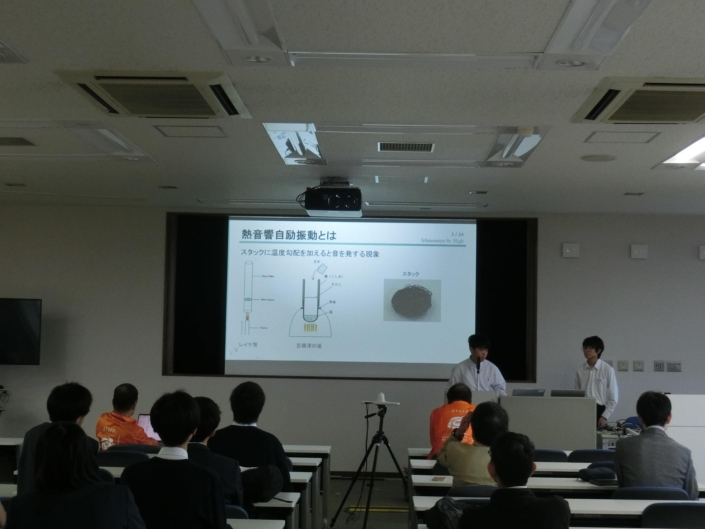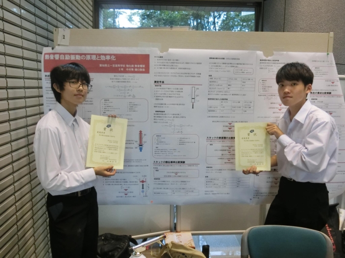 物化部熱音響班(2年生2名)が高校生科学研究室(NIFSオープンキャンパス)に参加し、「熱音響自励振動の効率化」の成果発表をし、最優秀賞を受賞しました。