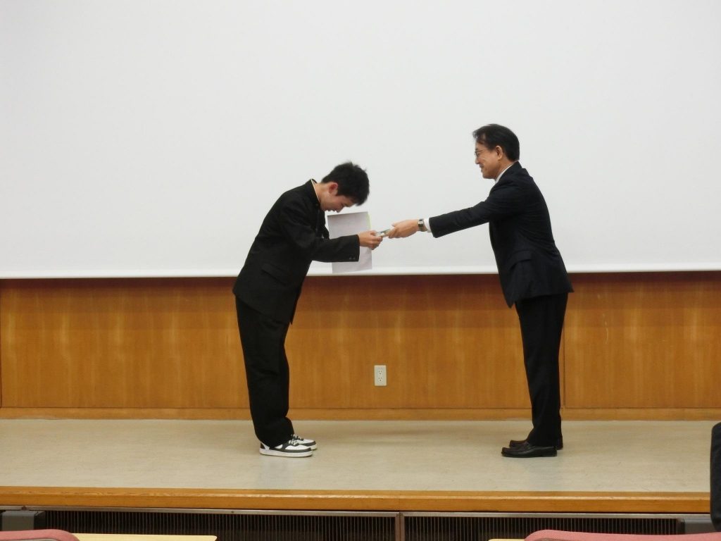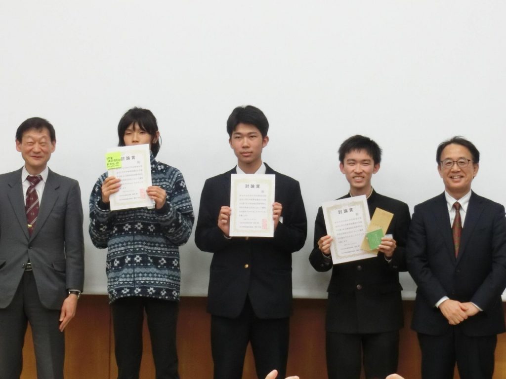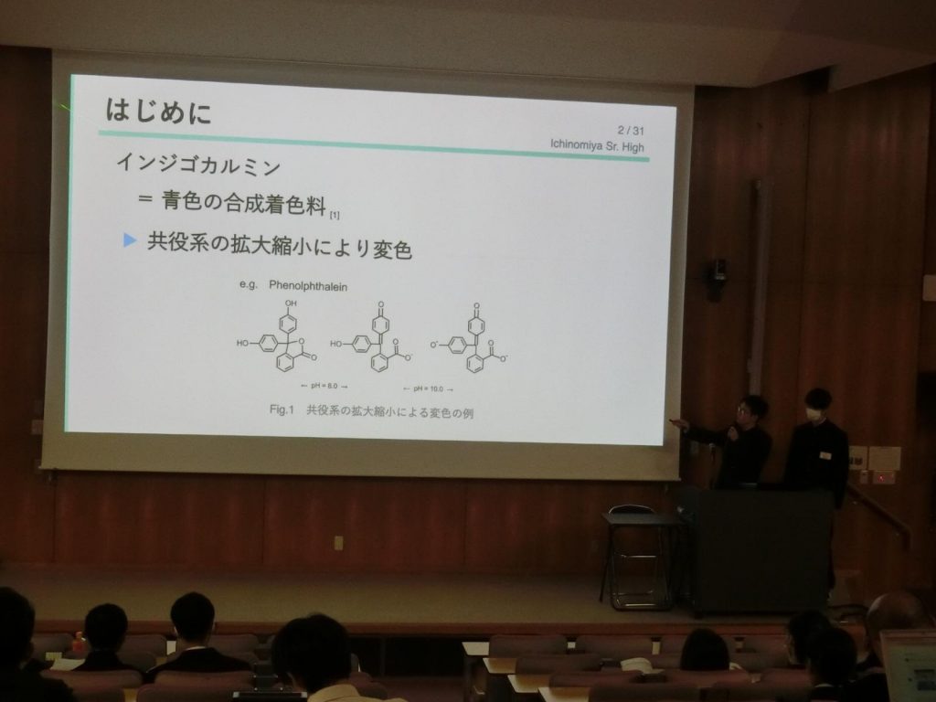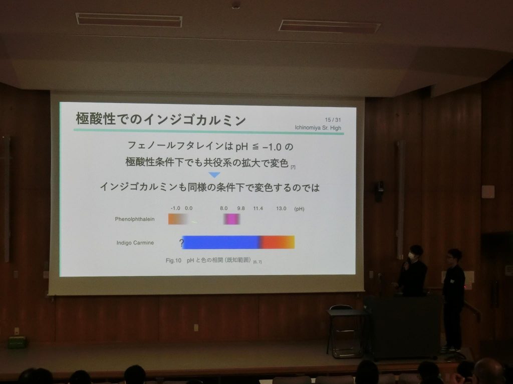 化学班2年生2名は「インジゴカルミンの酸性条件下における変色について」の成果を発表し、優秀賞を受賞しました。また、うち1名の生徒は質疑応答において積極的な参加を行い、討論賞を受賞しました。