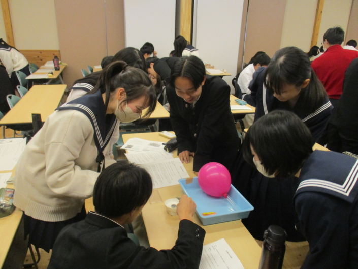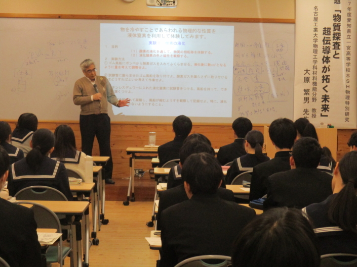 大原先生には、超伝導体についてのご講演をいただきました。超伝導現象の原理についての説明、歴史的な背景、産業への応用などについて、幅広く、わかりやすく説明をしていただきました。講演の中では、生徒が実際に超伝導体を用いた実験や低温実験を行う機会も設けていただき、ただ知識を得るだけでなく、感動する経験を積むことができました。生徒にとって刺激的な時間となったようです。