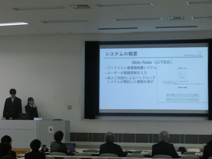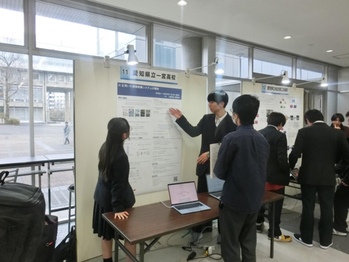 お知らせ/物化部 【物化部】第24回AITサイエンス大賞 2025年12月16日 日時 令和7年12月13日(土) 9:50~15:15 会場 愛知工業大学 八草キャンパス 主催 愛知工業大学 物化部14名(発表者:1年生2名、聴衆:1年生8名、2年生4名)は、愛知、岐阜、三重、静岡、長野の高校が集う第24回AITサイエンス大賞に参加をしました。 ものづくり部門において、情報班1年生は「AIを用いた書籍推薦システムの開発」の成果を発表しました。午前にステージ発表を行い、午後はポスター発表を行いました。他校の生徒や先生方から多数の質問や意見をもらうことができました。
