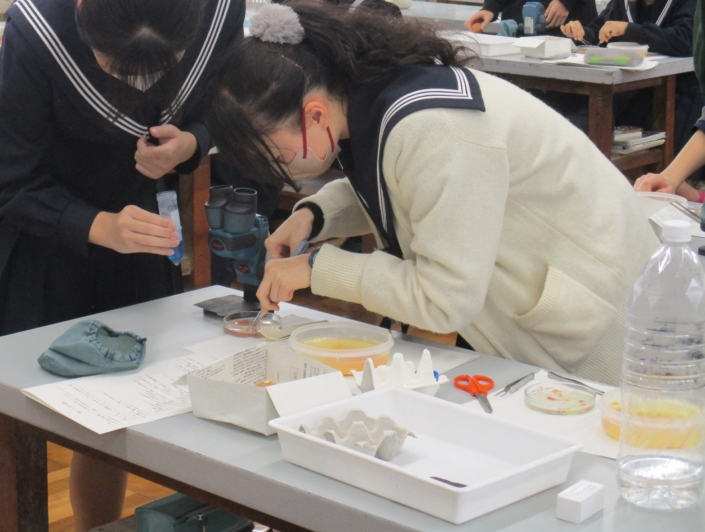 講演会に先立って、8日(月)と11日(木)に2年理系生物選択生徒を対象に、ニワトリの胚発生に関する観察実験を行いました。強い衝撃で卵膜が破れてしまうため、細心の注意を払いながら生きたままの胚や固定染色して肢の発生具合が分かるようになった胚などを観察しました。
