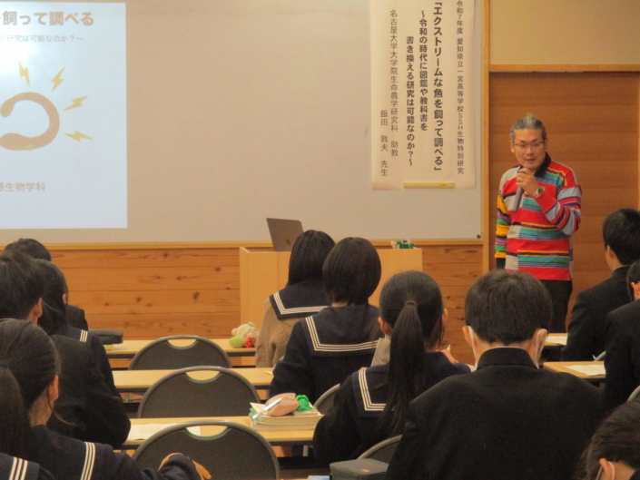 飯田先生には、胎生魚やデンキウナギなど特殊機能をもつ生物に対し、主に発生学の観点から、哺乳類との比較や遺伝子導入など高校の授業に沿ったご講演をいただきました。また、解剖学や系統発生学などのお話もいただきました。