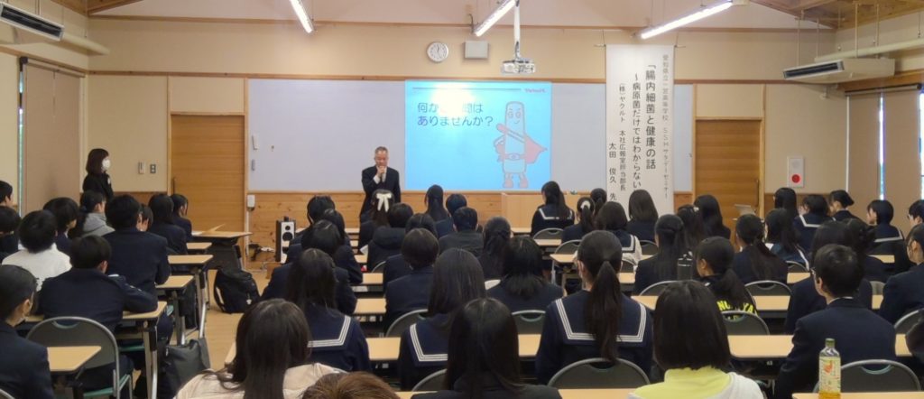 人体最大の免疫機関であり、生体防御の最前線であるといわれている腸の環境について、ヤクルト本社より太田俊久先生をお招きして、セミナーを開催いたしました。腸内細菌が心身に及ぼす影響や、研究職についての話も聞け、参加した生徒からは「講演内容もとても面白くて聞きに来て良かった。腸内環境について学びを得たことはもちろん、研究職の面白さや広報としての経験談も参考になった。」との感想が聞かれました。