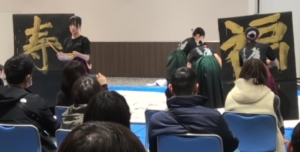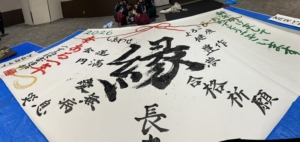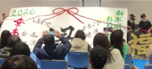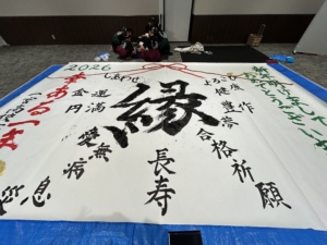 お知らせ/書道部 2026年書道部始動! 2026年1月23日 2026年活動始めは、1月10日(土)にイオンモール長久手で開催された書道パフォーマンスでした。本校のほかに、中部大春日丘、豊川、愛知商業、名古屋市立桜台高校が参加したイベントです。各校とも年明けにふさわしい趣向を凝らしたパフォーマンスを披露し、本校も「長寿」「豊作」「無病息災」などといった言祝ぎのことばの数々を紙面に描きました。今年もみなさまと書道部にとって、実り多い一年になることを願います。