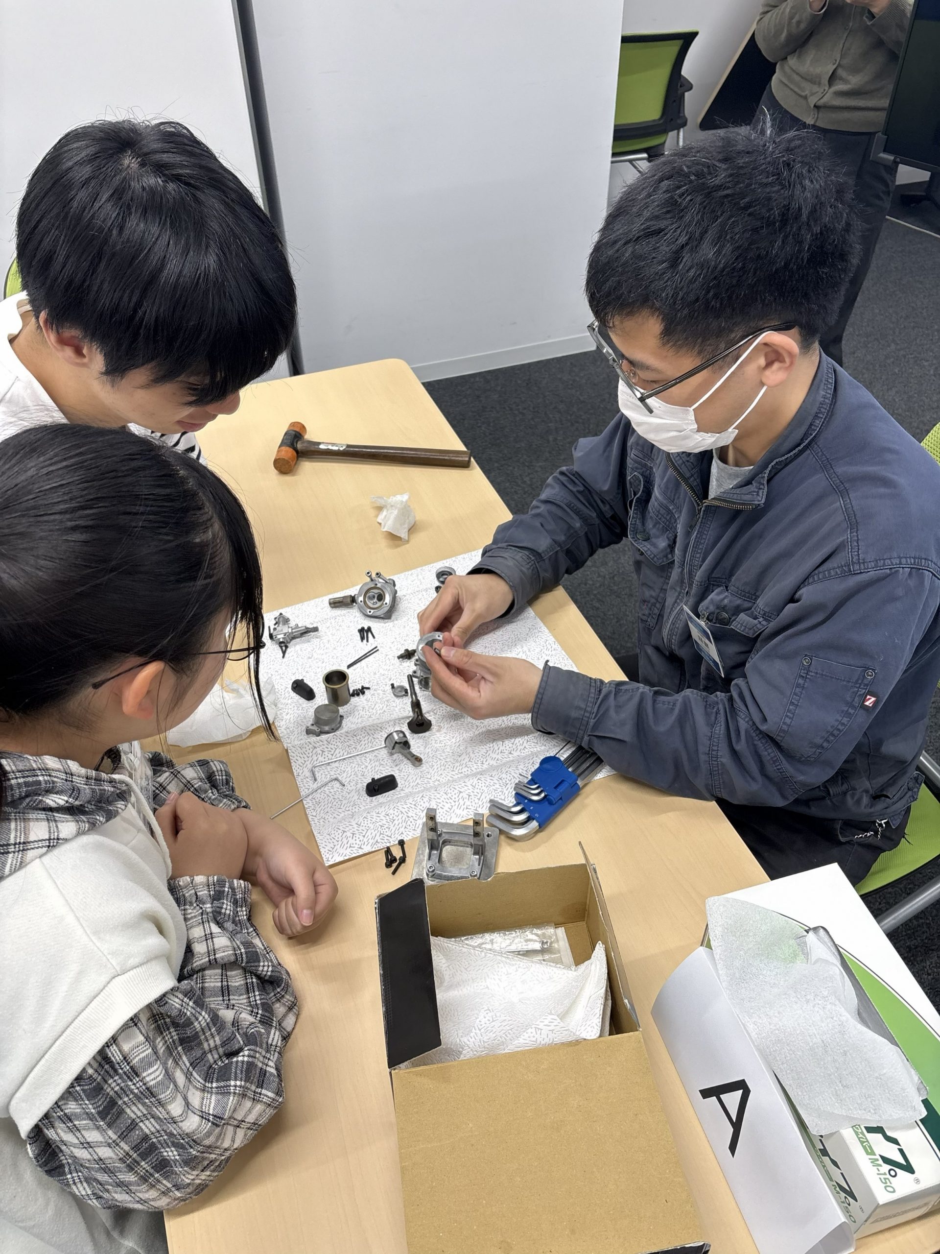 午前中は、熱機関の歴史やエンジンの構造についての講義を行いました。午後からは、実際にエンジンを分解し、各パーツについての役割を学んだり、エンジンを組み立てながらその仕組みについての理解を深めました。