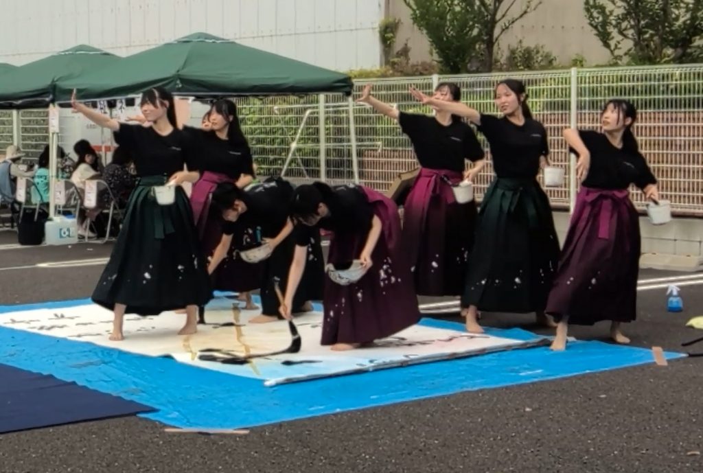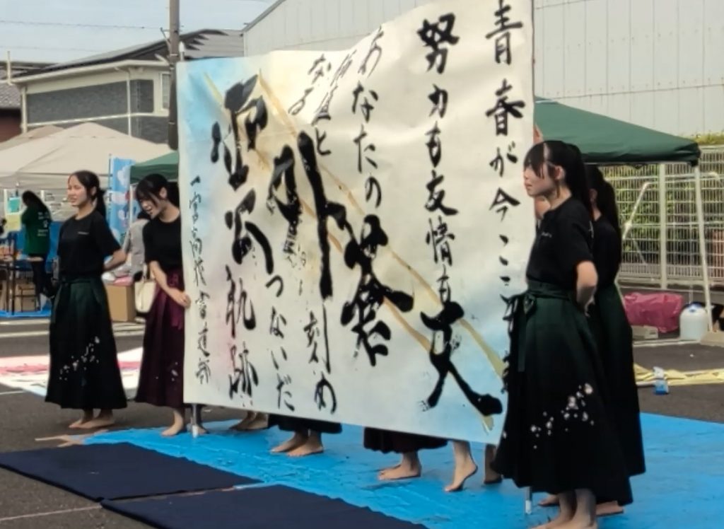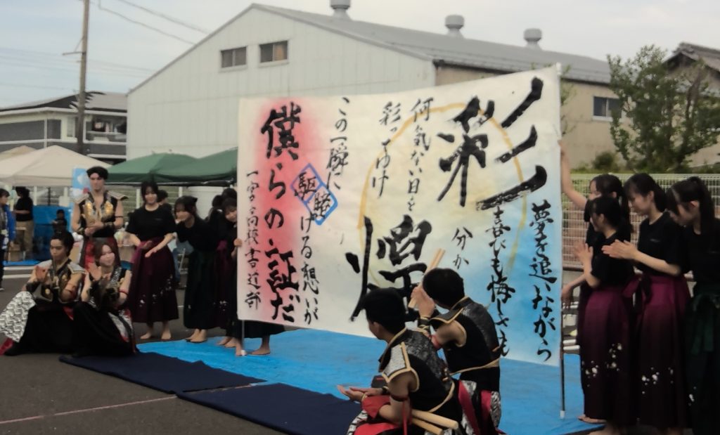 各務原太鼓保存会の方々は、「太鼓祭日本一決定戦」組太鼓一般の部で全国2連覇を果たすなど国内はもちろん、海外でも公演し、グローバルに活動されています。そんな各務原太鼓保存会の迫力ある演奏の後、勇ましい太鼓の音に乗って書道パフォーマンスをしました。新2年生だけで臨む初めてのイベントでしたが、各務原太鼓保存会の方々がうまくダンスに合わせてくださり、助かりました。その後は本校だけでもう一曲、新作書道パフォーマンスを披露しました。