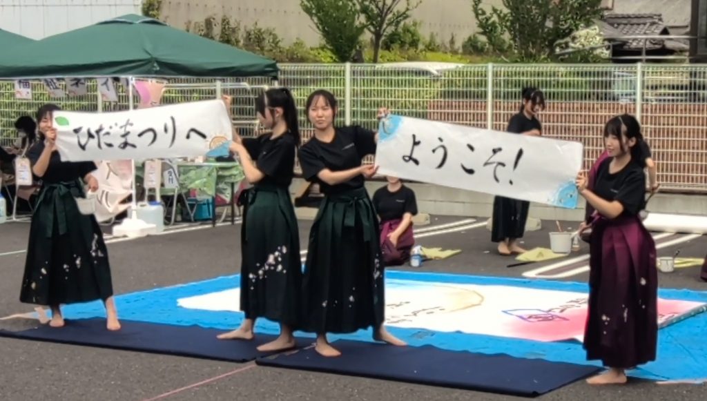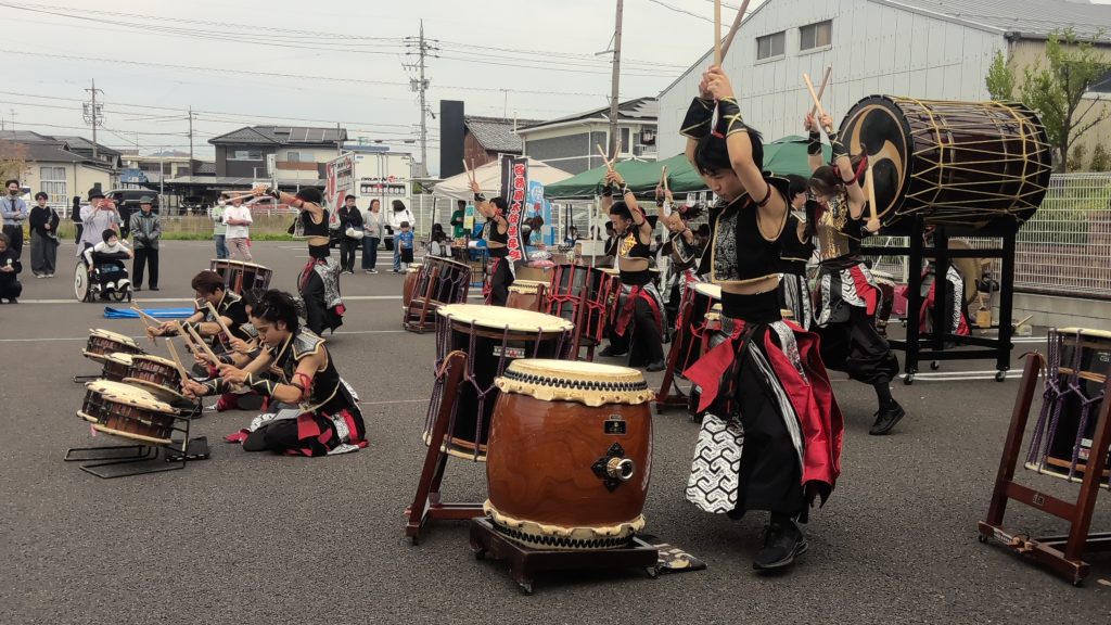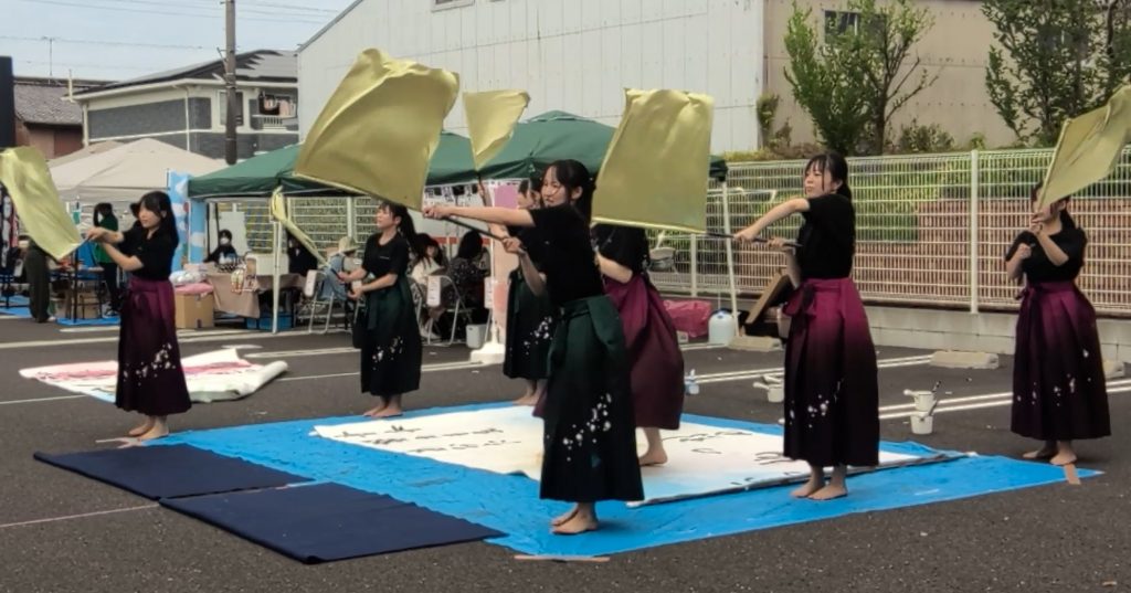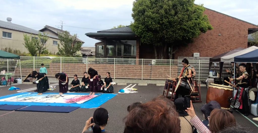 4月18日(土)に、一宮市北方町にあるメディカルケアホームひだまりで開催されたイベント「ひだまつり」に出演し、書道パフォーマンスを披露しました。しかも今回は、各務原太鼓保存会の方々とのコラボコーナーもありました。