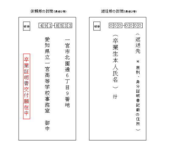 ※ 愛知県内にお住まいの方は、本人があらかじめ電話で依頼し、後日来校して受領してください。